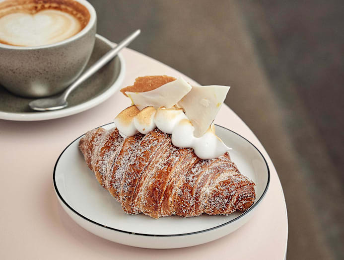 Generously filled with luscious lemon curd, dusted with lemon sugar, and topped with torched meringue and white chocolate shards, this splintery, airy croissant – which looks very fancy – delivers a zingy tang that’s perfect for lemon lovers.