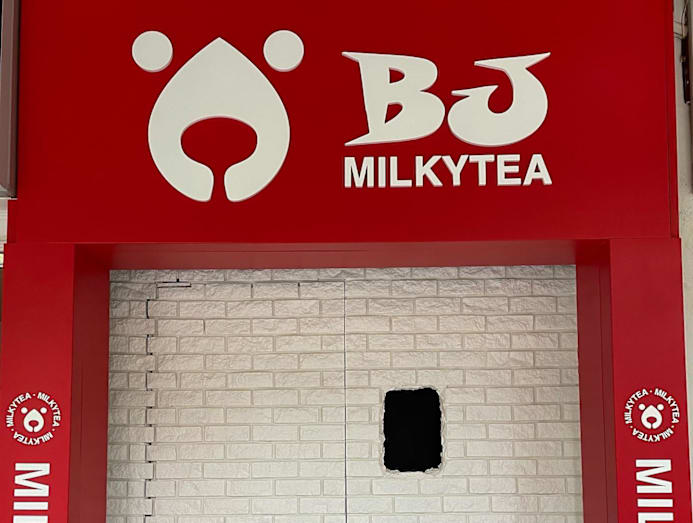 The kiosk’s facade is entirely covered by a faux brick wall, save for a tiny hole with a curtain. This is where BJ Milkytea’s staff stick out their arms and pass bubble tea orders to customers (best safe distancing safety measure, we say).