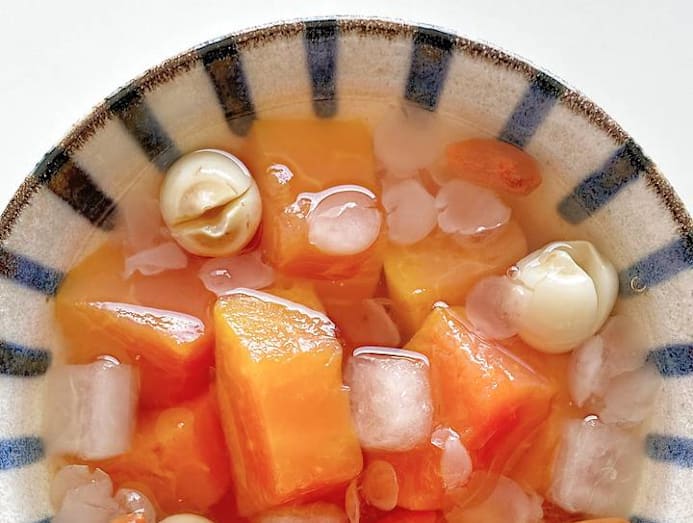 Tangy and fruity with a light floral undertone, this brew is made with peach gum (the resin from peach and Chinese wild peach trees, purportedly rich in amino acids which allows the body to absorb collagen quickly), China Fuji apple, osmanthus, goji berries and candied Winter Melon and is believed to boost metabolism and reduce stress. We like the contrasting textures in this brew from the lightly perfumed gelatinous globs of peach gum and the crunchy apples. It would probably go down well after an especially greasy meal.