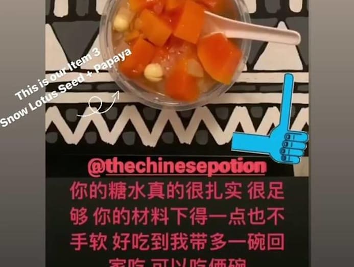 The enterprising mum has also been actively reaching out to influencers and celebrities like Michelle Chong, Cynthia Koh, David Gan and Zoe Tay to spread the word. All by messaging them on their Instagram accounts — IG truly is the great social equaliser. “They have been very kind and have posted about my brews on their social media [accounts],” she says. “I think David Gan really likes it ’cos he posted twice.” Here’s the English translation of what he wrote: “Your tang shui is really solid, very filling. You’re generous with your ingredients. It’s so delicious, I brought one more bowl home to eat. I can eat two bowls.”
