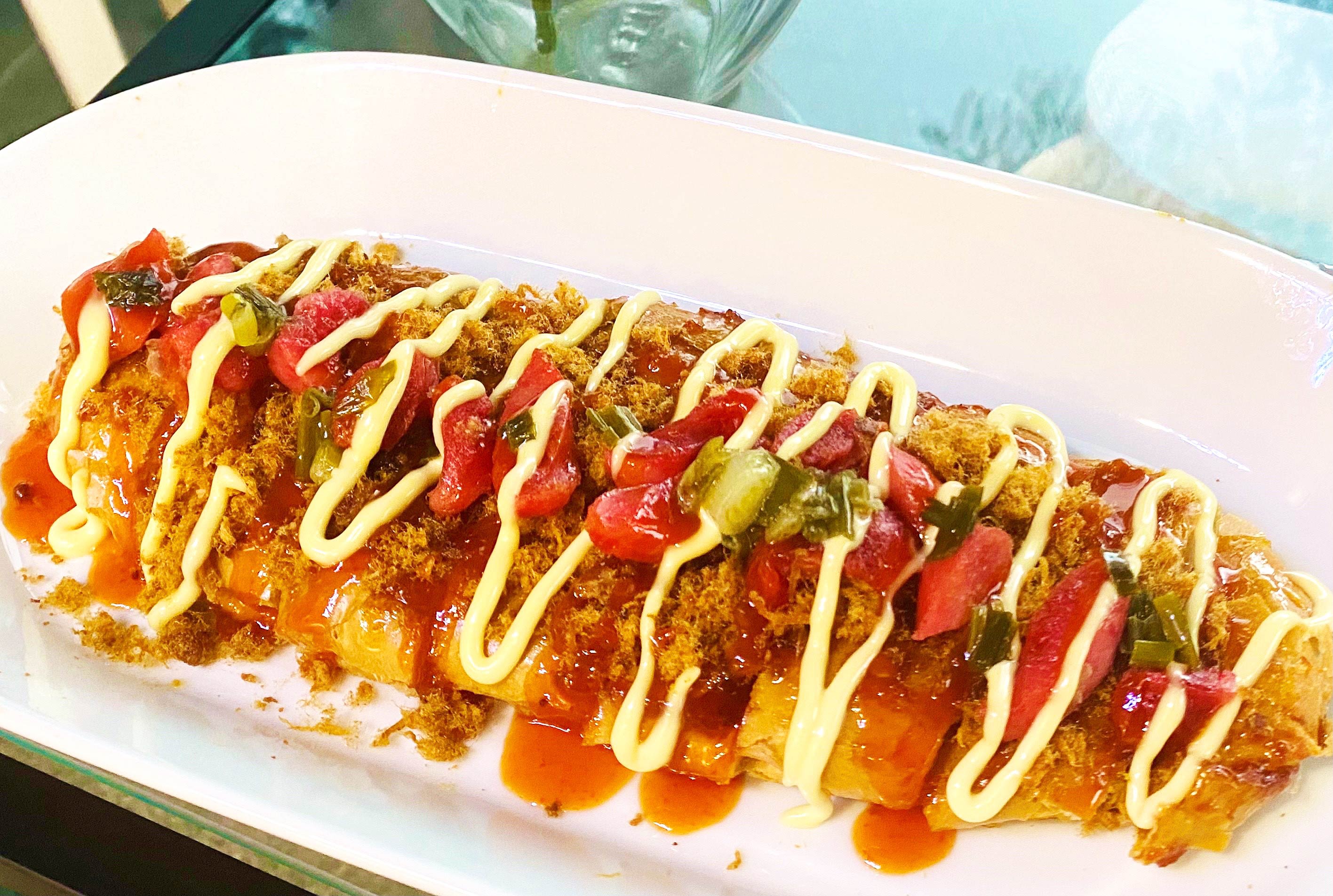 Their cheapest banh mi option. It comes with pork floss, pork sausage, butter sauce and chilli oil, arranged on top of supplier-bought Vietnamese-style baguette as an open-faced sarnie. The loaf is cut breadwise for easier munching – Hoo-Gah provides cutlery or a pair of gloves if you want to get down and dirty.