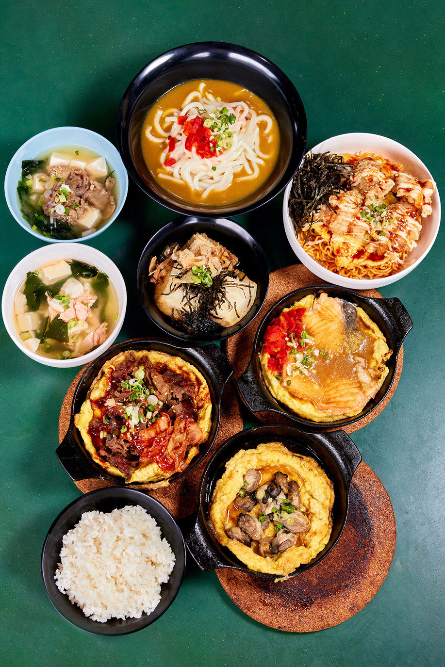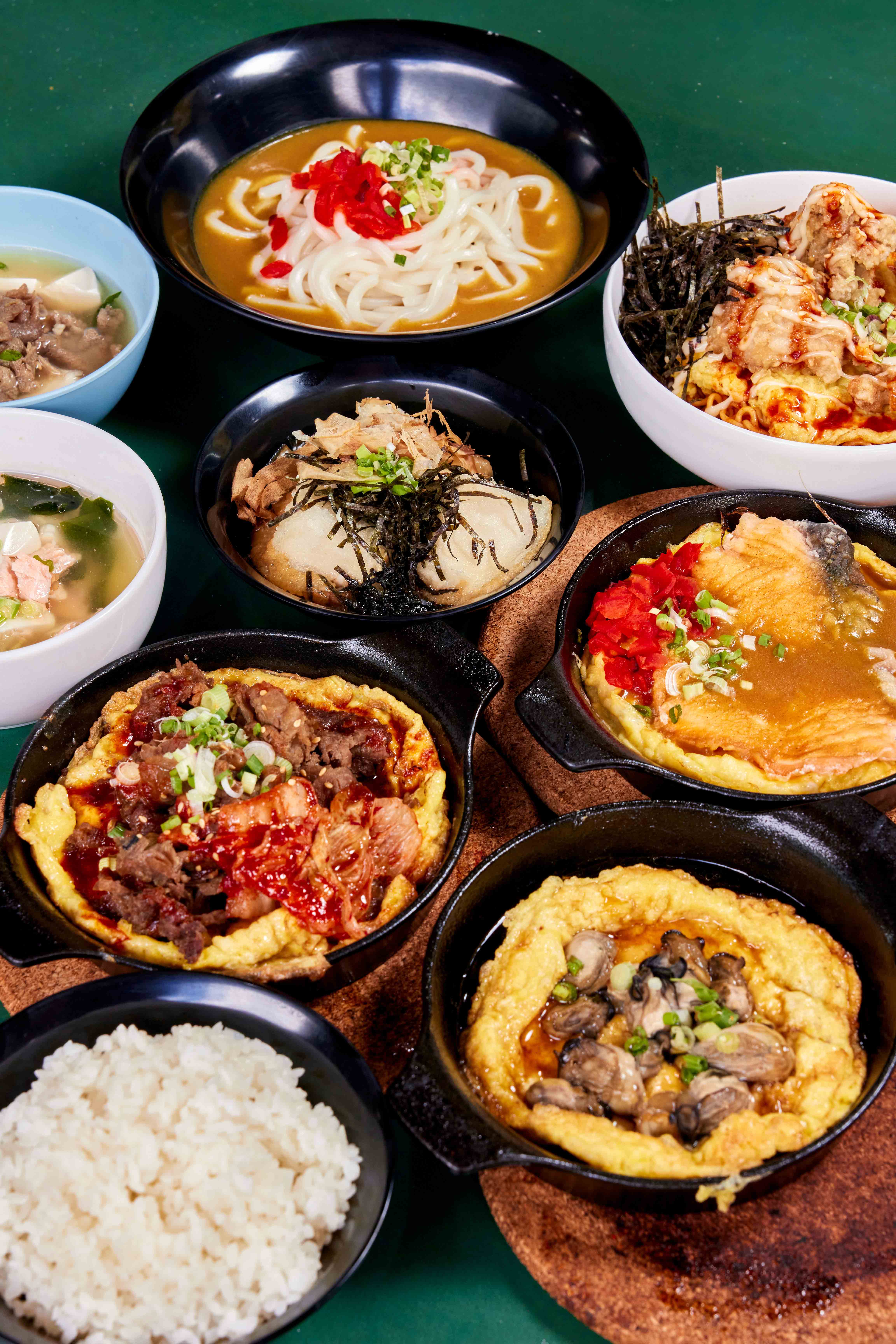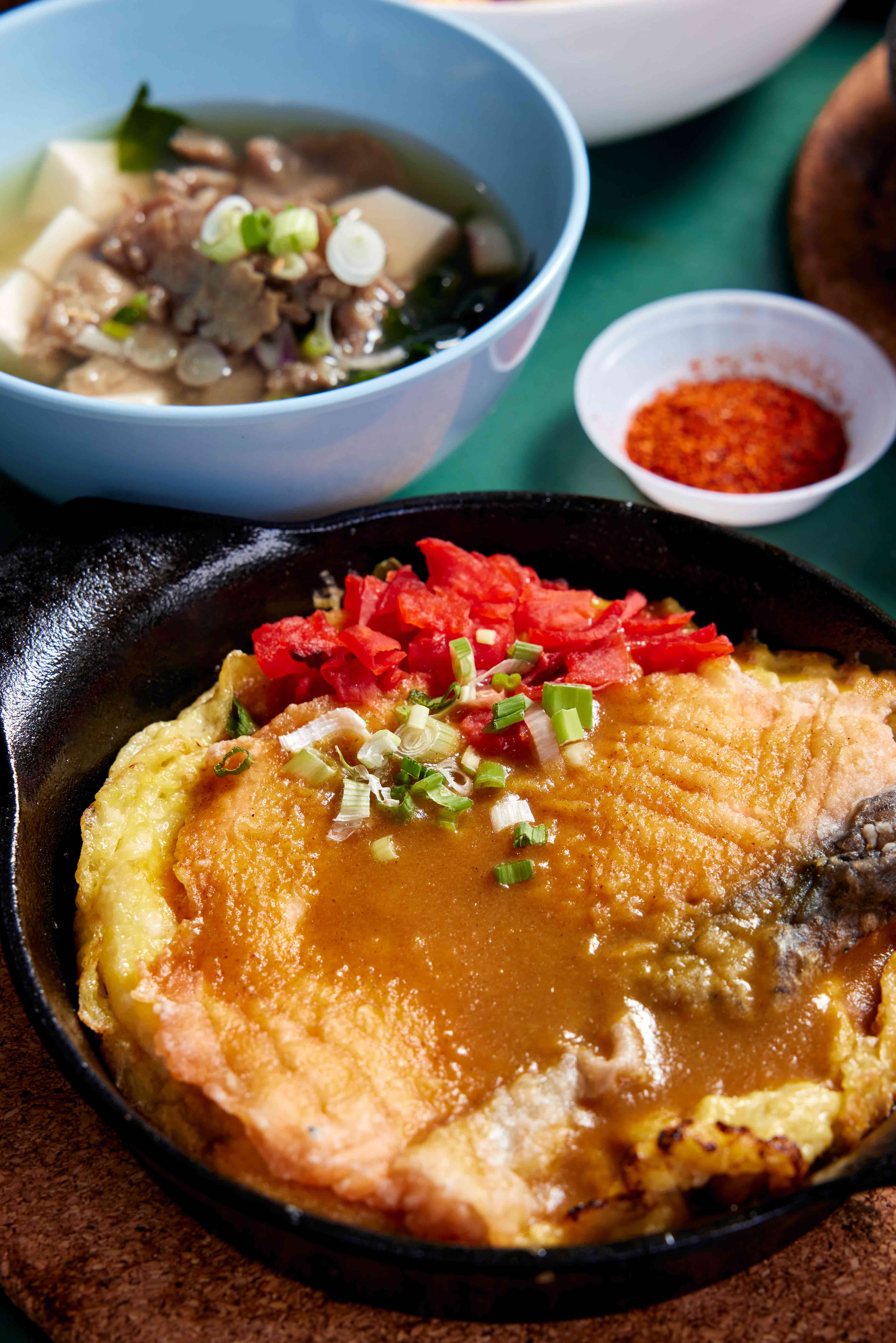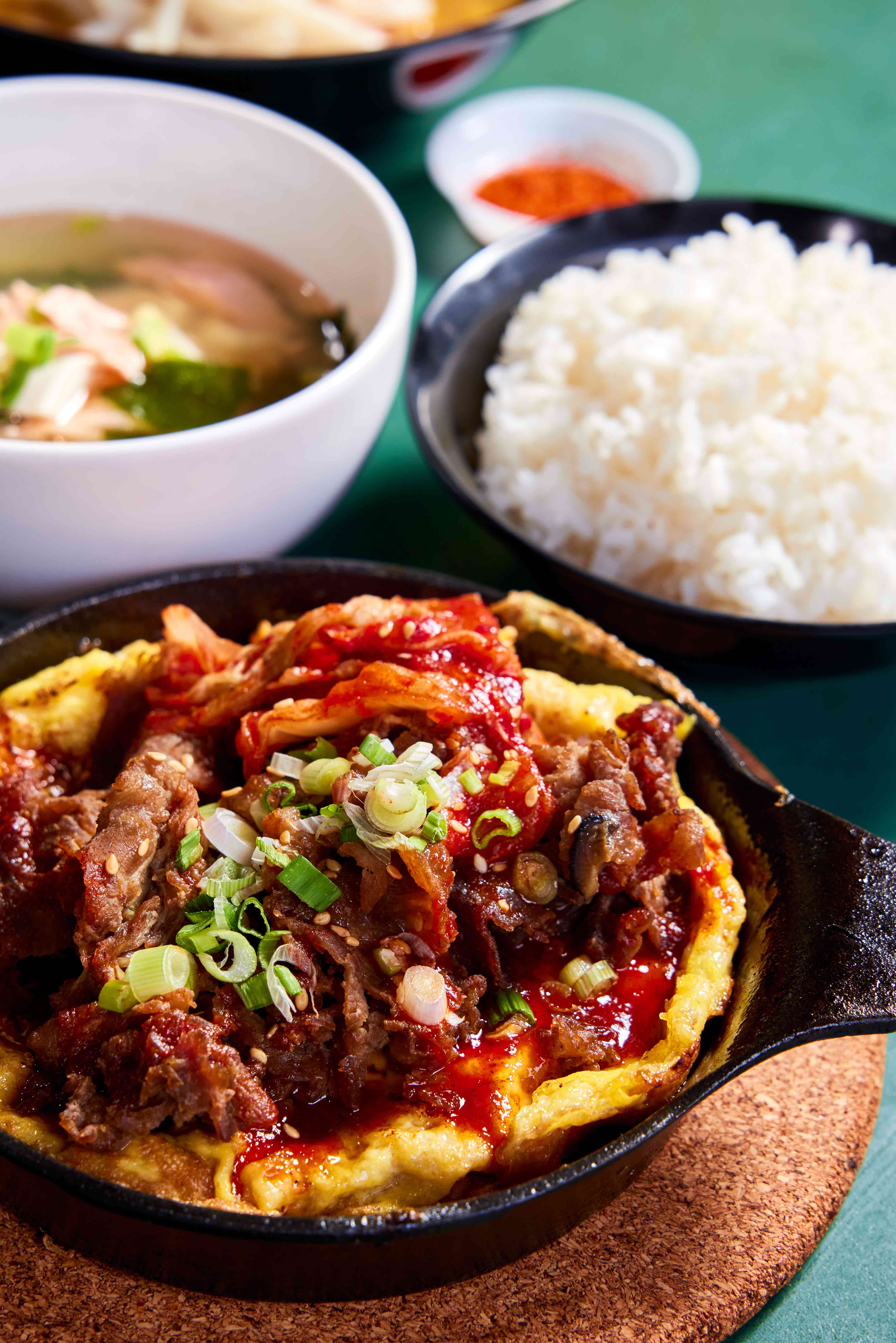 Served over an omelette made with two eggs, it is then topped with the original brown glaze (the signature sauce), Japanese curry or kimchi cheese. You can also have your omelette with Korean ramen instead of rice.