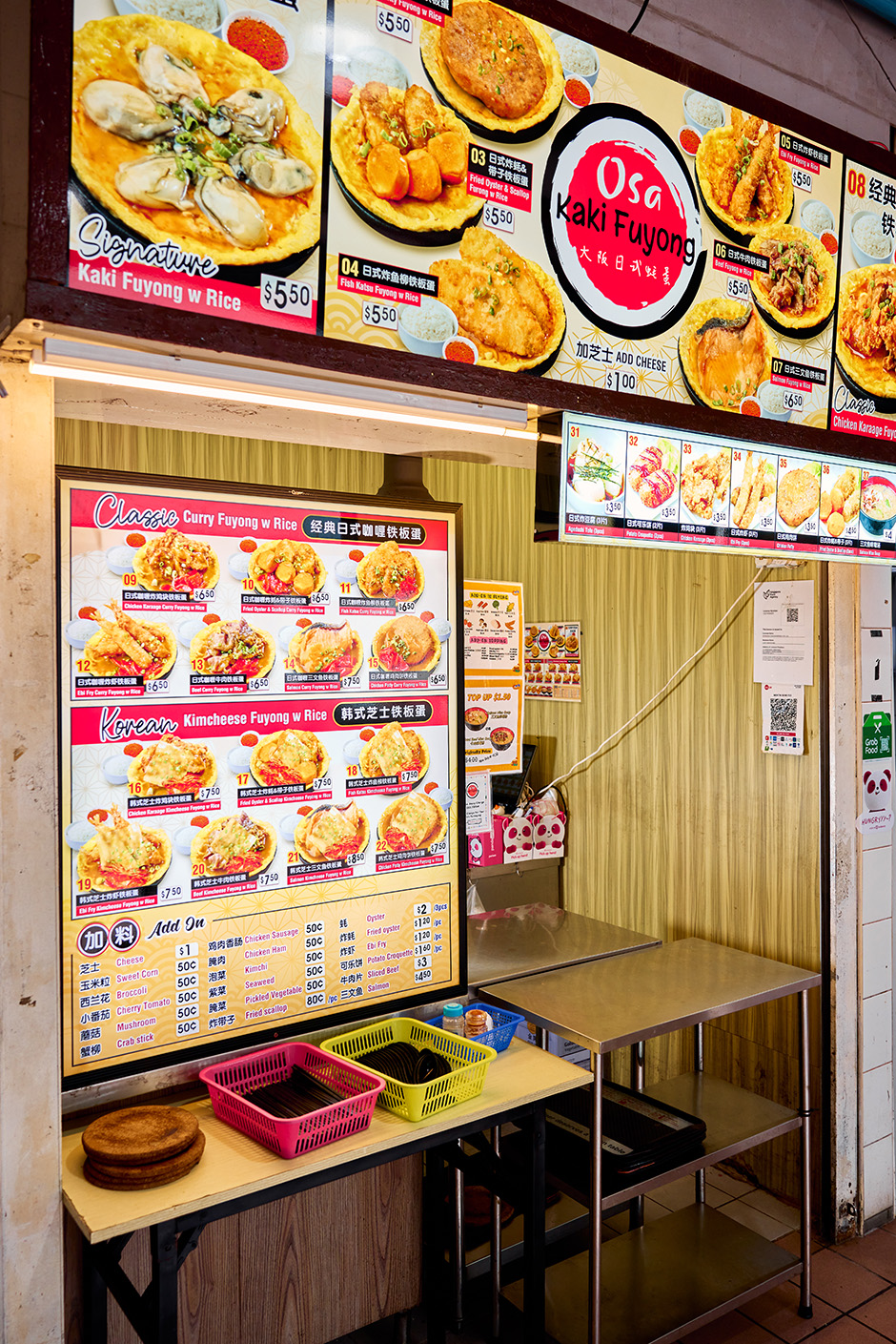 After leaving NP, the brothers hired Ah Meng to work at their Mentai Donburi stall at a coffeeshop in Ang Mo Kio. They also run Beauty World Wanton Mee at Beauty World Centre. When the stall next to their Wanton Mee stall was available, the brothers grabbed it to start Osa Kaki Fuyong, naming it after the popular oyster omelette dish.