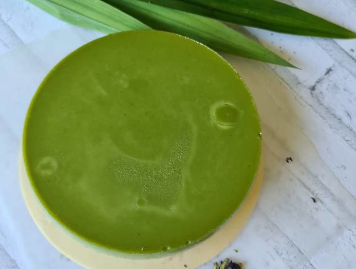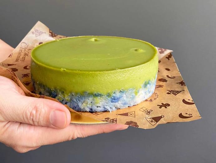 “It takes about three to four hours to finish each Kueh Salat round, but prep starts two days before I even start cooking.” The extra time is needed to soak the glutinous rice overnight and separate the juice and extract from around 100g of blended pandan leaves per kueh. The juice and extract is used to colour and flavour the kueh’s pastel-green custard top, made with egg, and coconut milk. Natural blue dye, from butterfly pea flowers, are also used to speckle its base of sticky rice and coconut milk. Each layer is steamed for 30 to 45 minutes and needs at least two hours to set fully. “I don’t use gelatin to keep the custard firm. I add flour instead.” Indeed, her salat is very elegant — unblemished, satiny custard brimming with the intoxicating perfume of fresh pandan leaves, and the bed of rice it sits on is pretty awesome too: tender, moist and lemak with coconut milk. It’s quite reasonably priced too (Mrs Kueh’s similar-tasting Kueh Salat is $56 for a 7-inch round).
