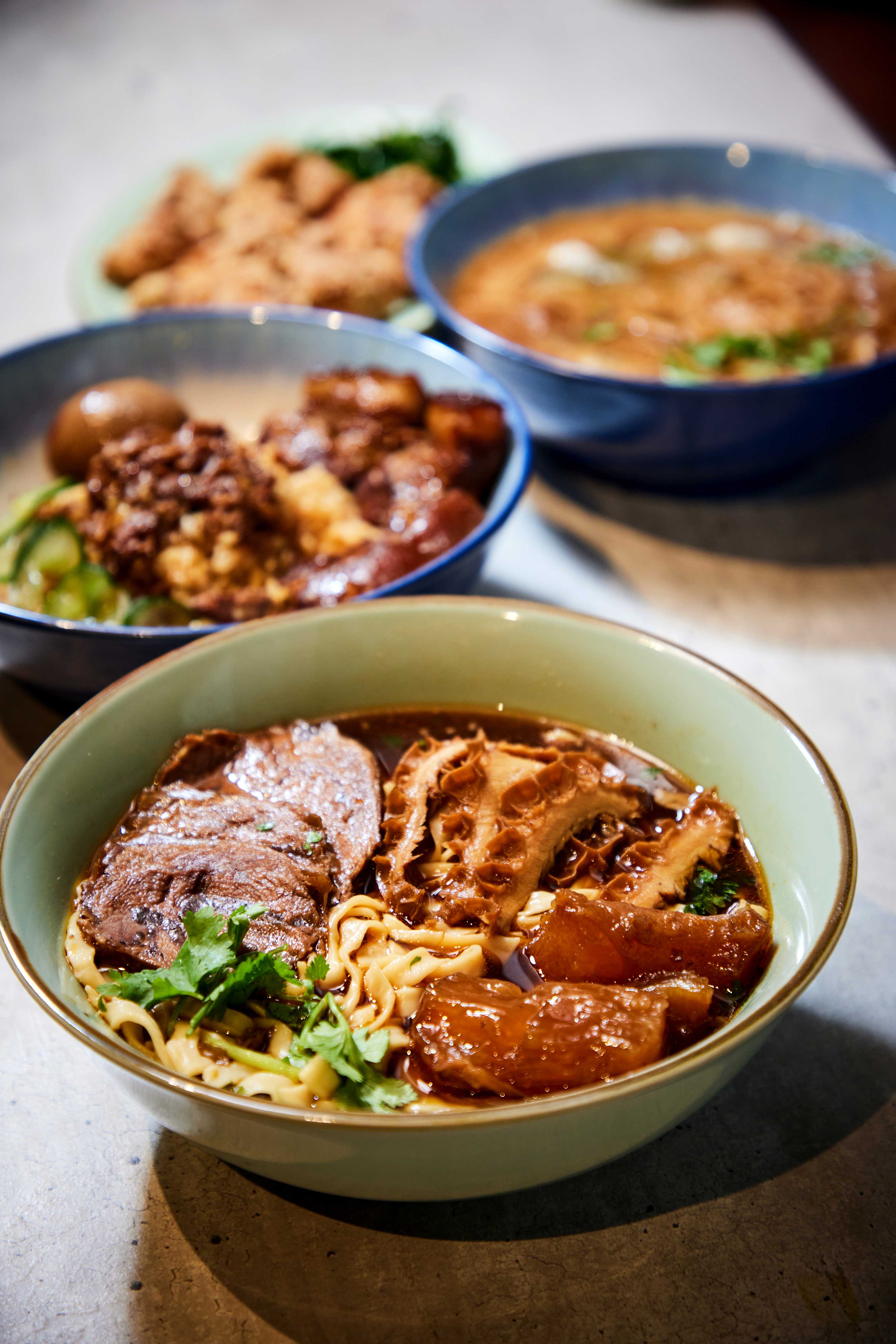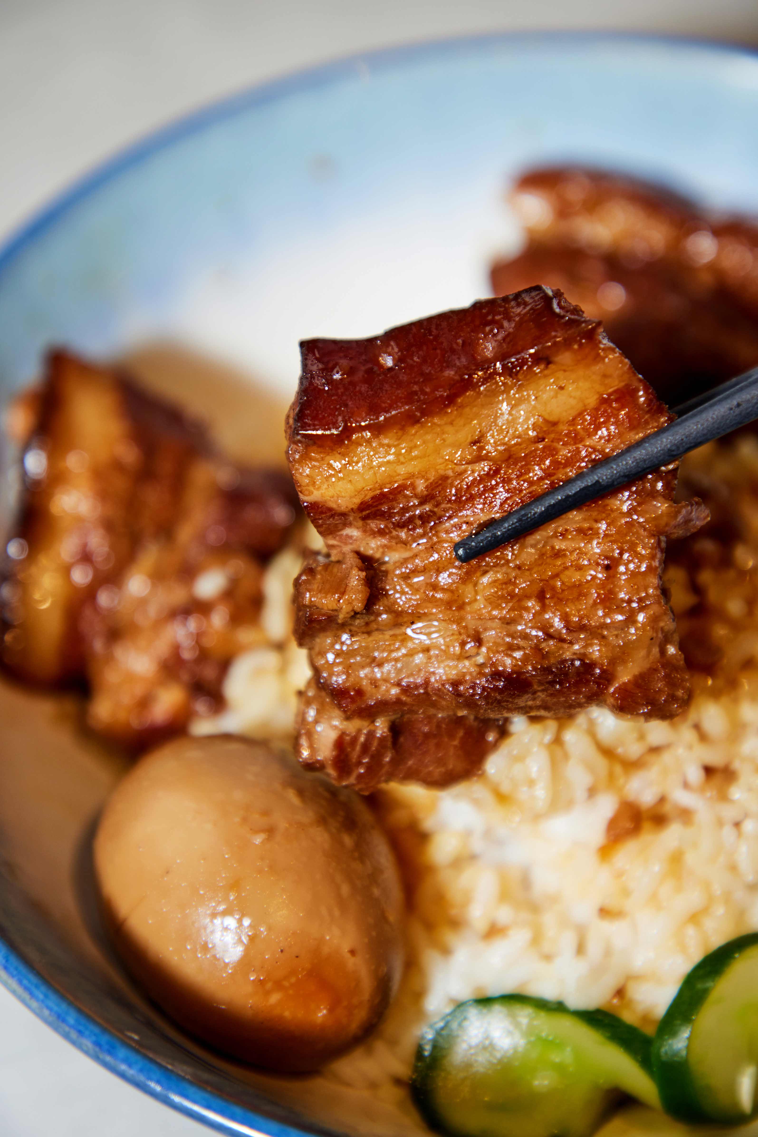 Morgan serves an amalgamation of kong rou fan, which uses thick slices of pork belly and minced meat used in lu rou fan in this version (both “kong” and “lu” refer to braising). Both types of meat are stewed overnight in a ruddy base of soy sauce, five-spice powder and Chinese wine. The tender pork belly, hand-picked by Morgan, is not too fatty but flavourful enough to act as the perfect foil to the leaner minced meat when poured over plain rice. Together with the braised egg and pickled cucumber, this is a filling, satisfying bowl.
