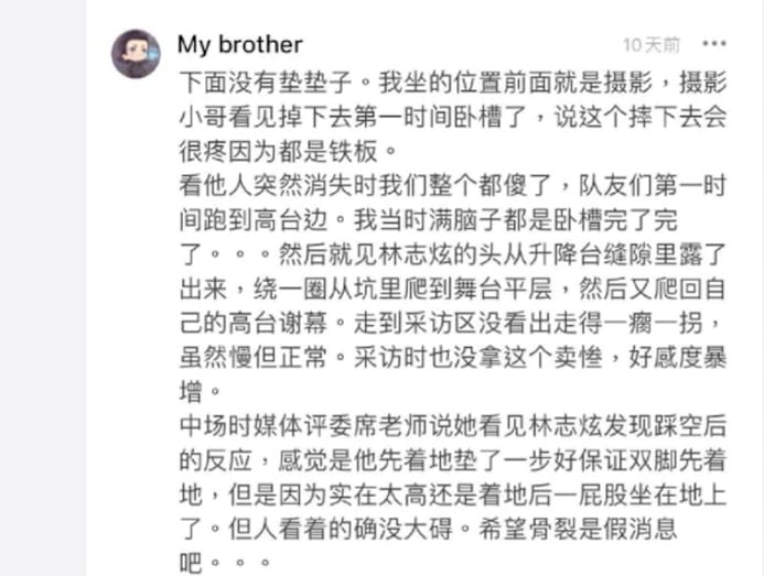 A netizen, who was at the scene, said the audience and crew were stunned when Terry fell. They also feared that he would be seriously injured as he had fallen onto a hard metal surface.