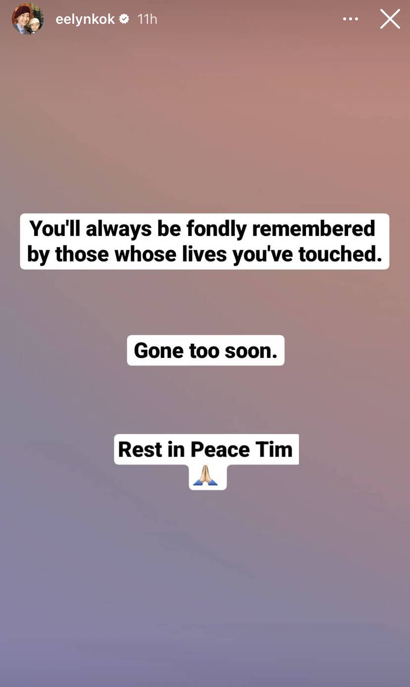 “You'll always be fondly remembered by those whose lives you’ve touched. Gone too soon. Rest in peace Tim,” she wrote.