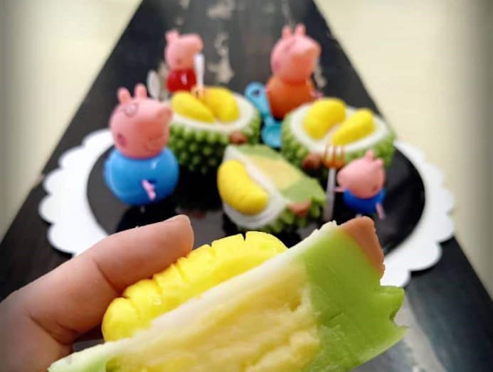 “She does it all by herself. The shape of the durian is made with [agar-agar and] moulds, but controlling the colours and putting them in layer by layer is pretty time-consuming,” he explains.
