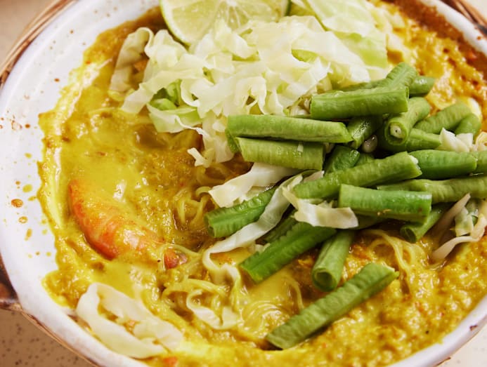 This particular Thai laksa dish is Jacob’s own invention, a mashup of recipes he’s found both on and offline. It’s made by blending and frying 11 herbs – including shallots, garlic, ginger, turmeric, candlenut, lemongrass, and basil to make a paste that’s infused with coconut milk into a fish-based broth, similar to how laksa lemak is made.