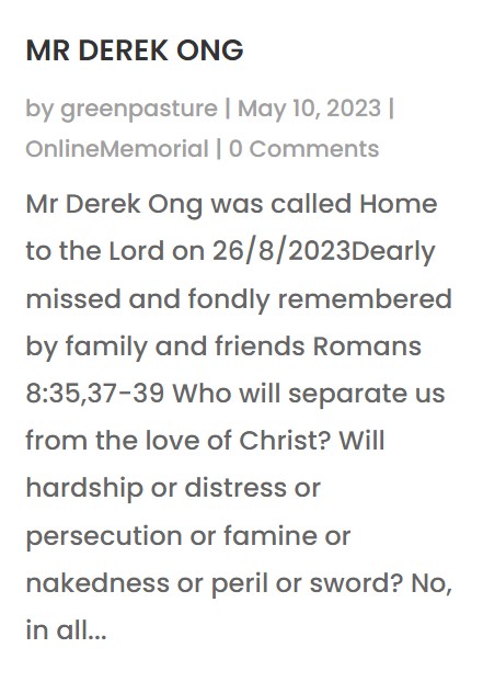 Photo: Green Pasture Christian-based funeral parlour Green Pasture posted an online memorial for Derek on its website. His cause of death was not revealed. According to Derek’s Instagram page, he has two children.