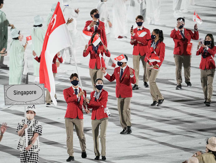 Glorious purpose: Team Singapore's contingent led by flag bearers Loh Kean Yew and Yu Mengyu.
