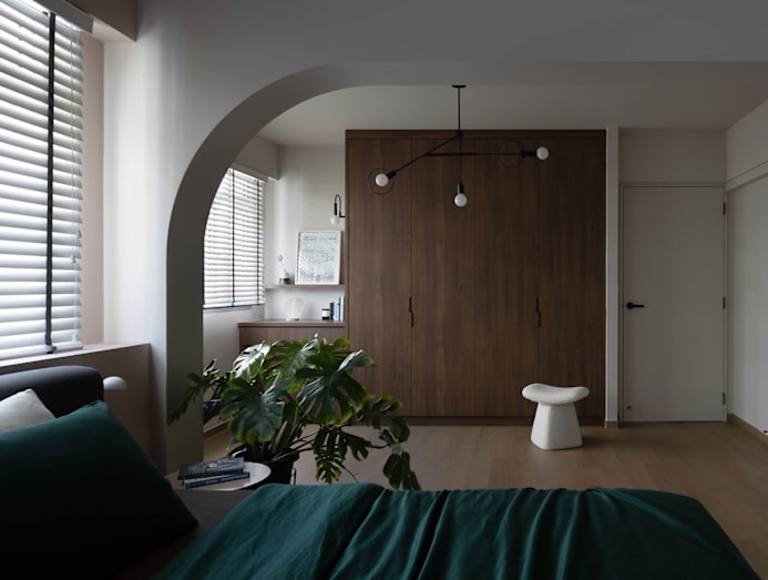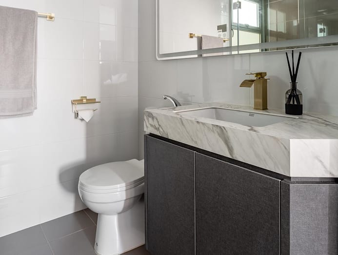 Walk through the master bedroom’s striking red door and you’ll realise there’s a markedly different look in here. While the common areas outside are superbly quirky and fun, the master bedroom and bathroom feature soothing design elements that the missus likes — gold and marble details.