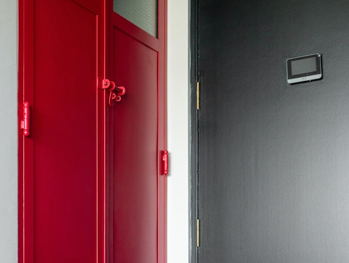The niche area with the DB box at the flat's entrance was originally the standard white laminated wooden doors provided by HDB. “However, it was too boring for the homeowners,” says Akemi. In line with the home’s quirky industrial theme, she proposed a vibrant red fire extinguisher-inspired door instead. Some shelves were added at the bottom for additional storage as well.