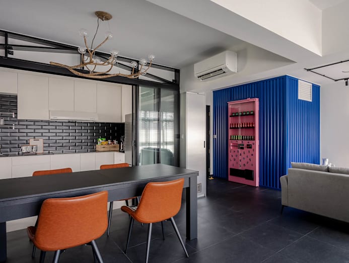 Although the kitchen cabinets are a minimalist plain white design, the backsplash made up of 3D black subway tiles adds visual interest. This not only creates more depth, but also complements the overall style of the flat. An industrial loft-style sliding door separates the kitchen and dining areas, and also serves as a break between the vibrant colours of the living room and the minimalist monotone kitchen.