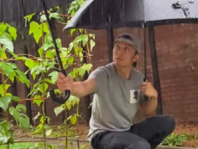 The star posted a clip of himself squatting in the rain, holding an umbrella for his vegetables. In the caption, he wrote: “This never-ending rain. I shall hold an umbrella for you.”