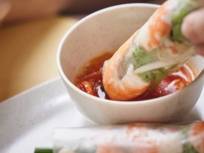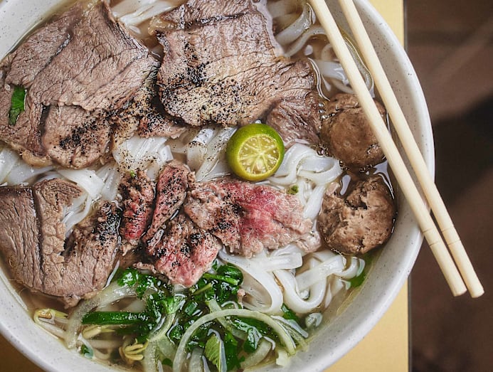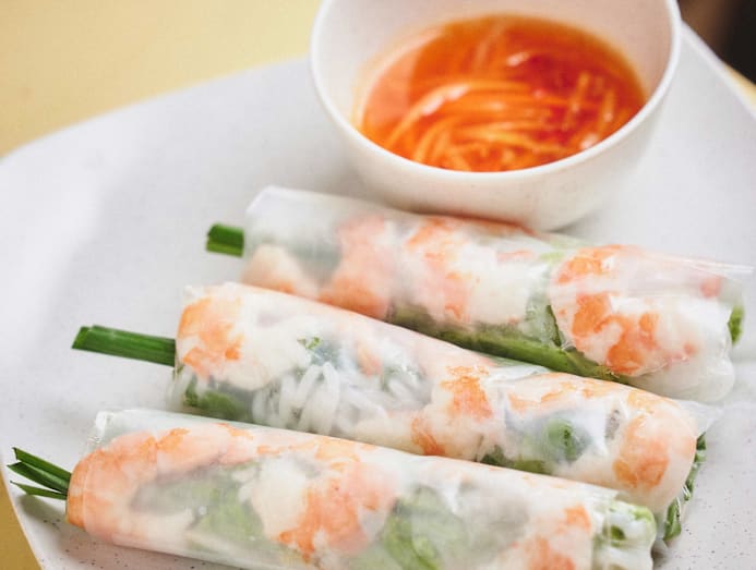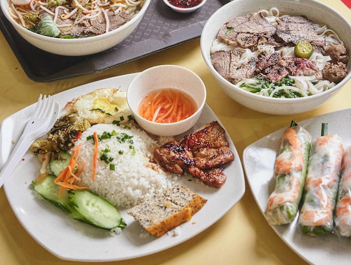 There are two noodle bowls – pho bo (beef noodle soup), a dish Vietnam’s best-known for, and its spicier, less popular cousin, bun bo (spicy beef noodle soup) – along with goi cuon (spring rolls made with rice paper) and com tam (broken rice, served with grilled chicken).