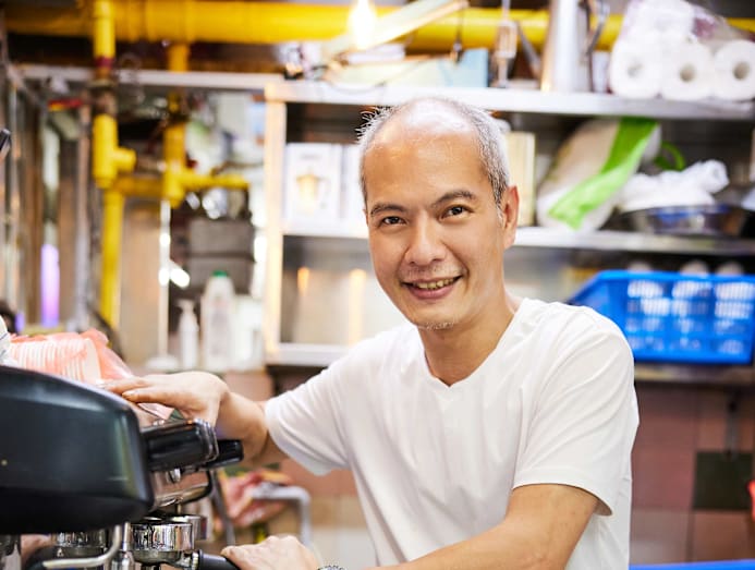 Petroleum-trader-turned-hawker Lawrence Tan, 47, owns Kopi More at Golden Mile Hawker Centre. He doles out local coffee and tea pulled from an espresso machine, garnering long queues (pre-pandemic) and celeb regulars like Edmund Chen and Xiang Yun, their son Chen Yixi, and Crazy Rich Asians star Henry Golding (before he moved to the US).