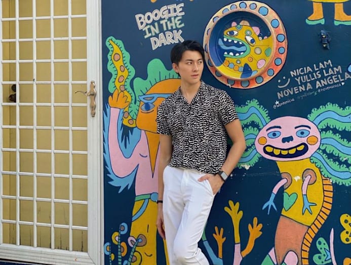 Black and white outfits don’t have to look dull as long as you get creative. Edwin paired a printed short sleeve shirt with white pants for a youthful look.