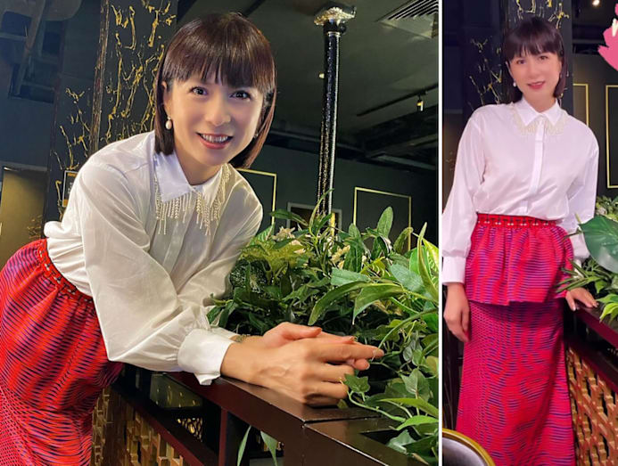 Lingling looked all set for National Day celebrations, sporting a dressy button-down shirt and red tiered skirt. We adore the pearl details on the collar.
