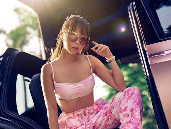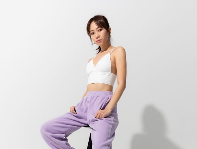 We like how Bonnie's #stayhome outfit of bralet and lavender track pants looks both comfy and cosy. Heading out? Throw on a pair of colourful kicks for a bold statement.