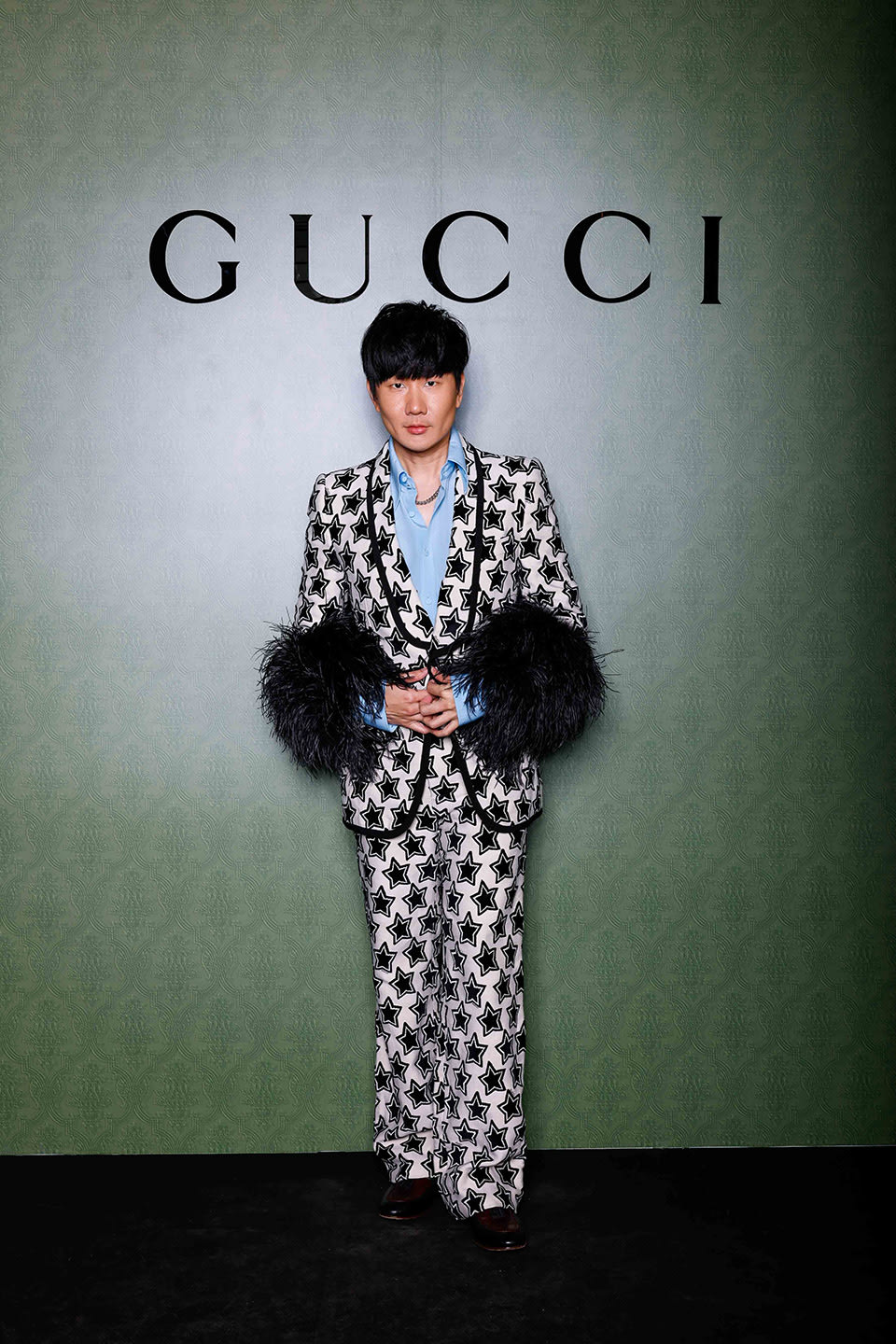 Clad in a star-print feather-trimmed suit, JJ stood out with his quirky getup (perhaps he took a page out of Sir Elton John’s stylebook?) at Gucci Marina Bay Sand’s re-opening party. Love!