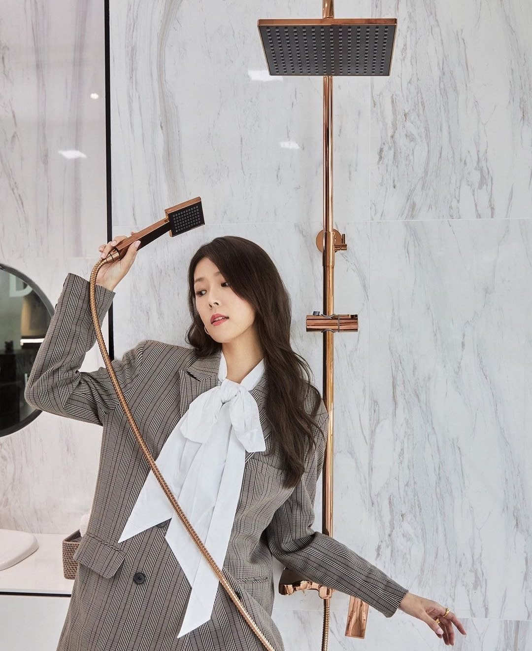 Who would have thought that posing with a shower head could look this chic? Carrie’s XL blazer might be menswear-inspired but she balanced it with a ladylike bow and shorts for a stylish and playful look.