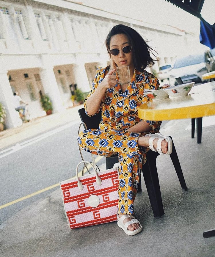 Pyjama dressing isn’t solely for the bedroom. Shu An donned a printed set by Gucci and colour clashed it with a romantic looking tote. The effect: An offbeat, fun and playful look that’s reserved for the truly stylish crowd.