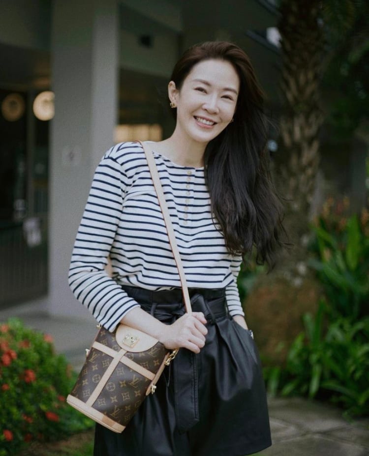 Looking radiant and ready for the weekend, Jesseca teamed a classic sailor striped top with high waist black shorts and a Louis Vuitton bag.