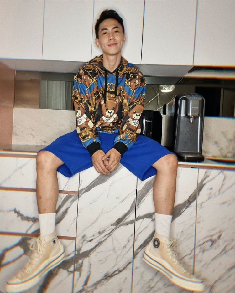 Think men can’t pull off cutesy fashion? Think again. Nick styled a bear print hoodie by Moschino with casual shocks and classic high cut sneakers, looking cool and charming at the same time.