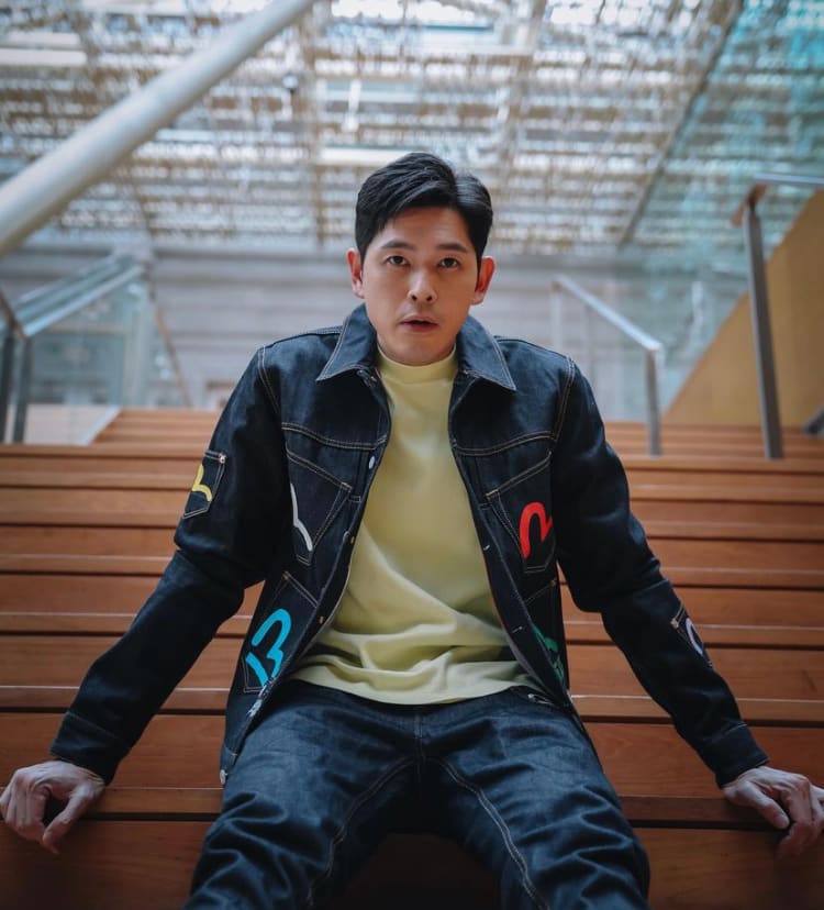 We’re loving the splashes of bright colours on Romeo’s denim jacket from Evisu; they add a mood-lifting effect to his laidback look.