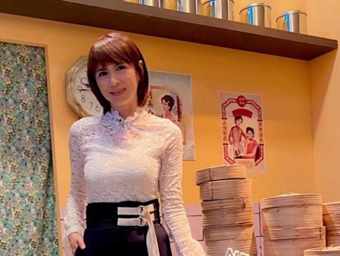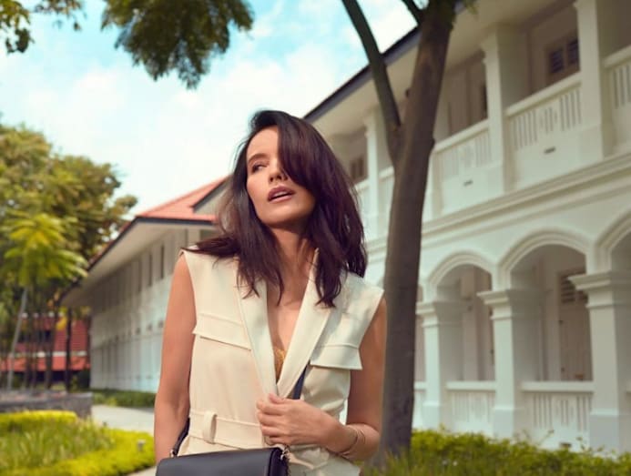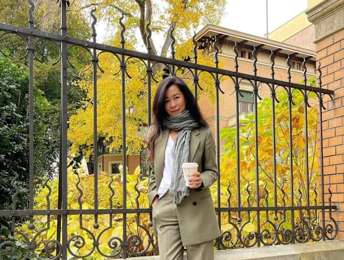 We love how effortlessly elegant Rui En looks in this ribbed one-shoulder beige dress. The suede boots add a boho touch to her OOTD.