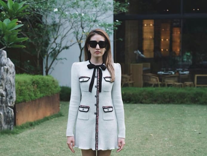 Wearing knee high boots in Singapore can be a challenging affair but Jesseca made it look so effortless. When paired with a navy military-style dress, the effect is both elegant and edgy. We just wish she’d removed the label on the sole (or is it part of the design?).