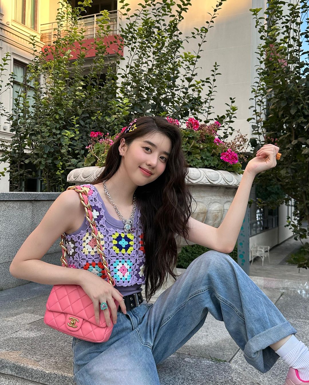 Also in a crocheted top this week was Eleanor, who was dripping in lots of fun candy colours from head to toe. That delightful bubblegum pink Chanel purse is perfect for the Barbiecore trend that’s all the rage now.