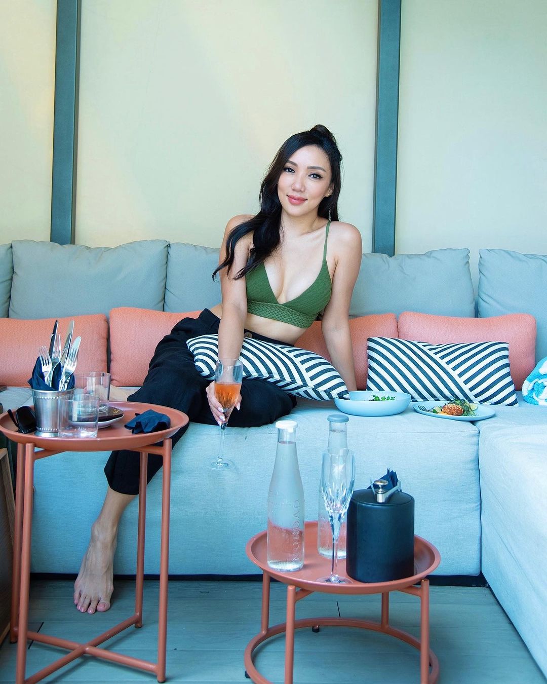 We don’t know how she does it but the DJ somehow manages to look cute, sexy, and comfortable all the same time as she lounges in a hotel poolside cabana with a glass of rosé in a moss green bralette and cropped pants. What a life.