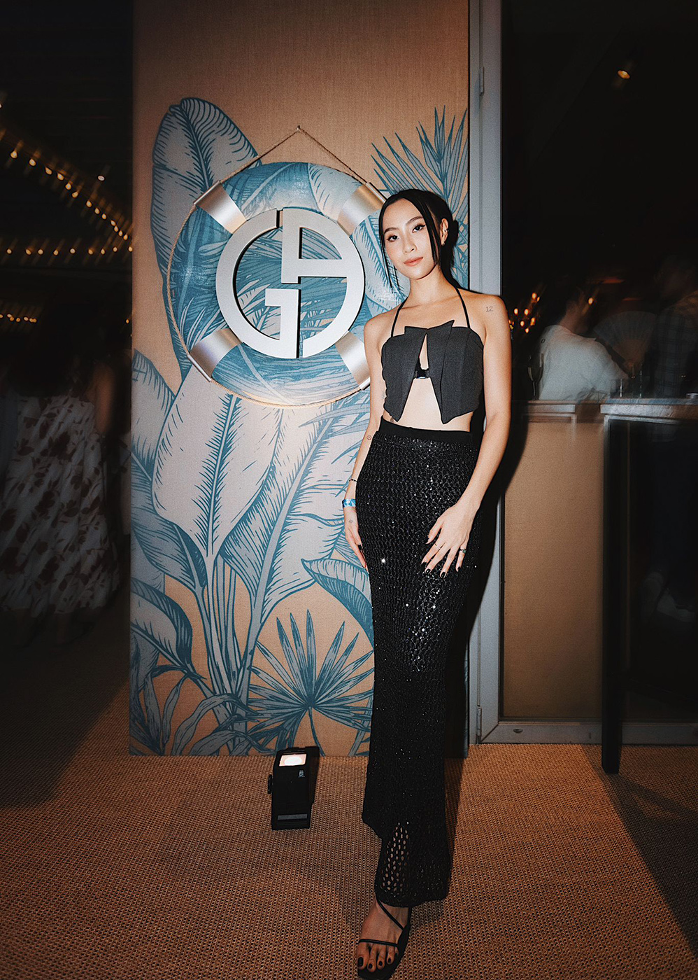 We love seeing interesting takes on classic clothing pieces and Sonia’s top, which appears to be the deconstructed panels of a suit jacket, definitely qualifies. Her sparkly skirt adds a much-needed fun and festive touch — the Giorgio Armani Mare event was a party, after all.