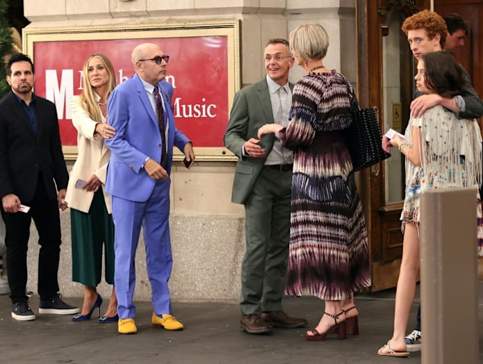 Back with the gang: Willie Garson filming scenes for 'And Just Like That...', the 'Sex and the City' reboot — with (from left) Mario Cantone, Sarah Jessica Parker David Eingenberg, Cynthia Nixon, Niall Cunningham — in New York City circa July 2021.
