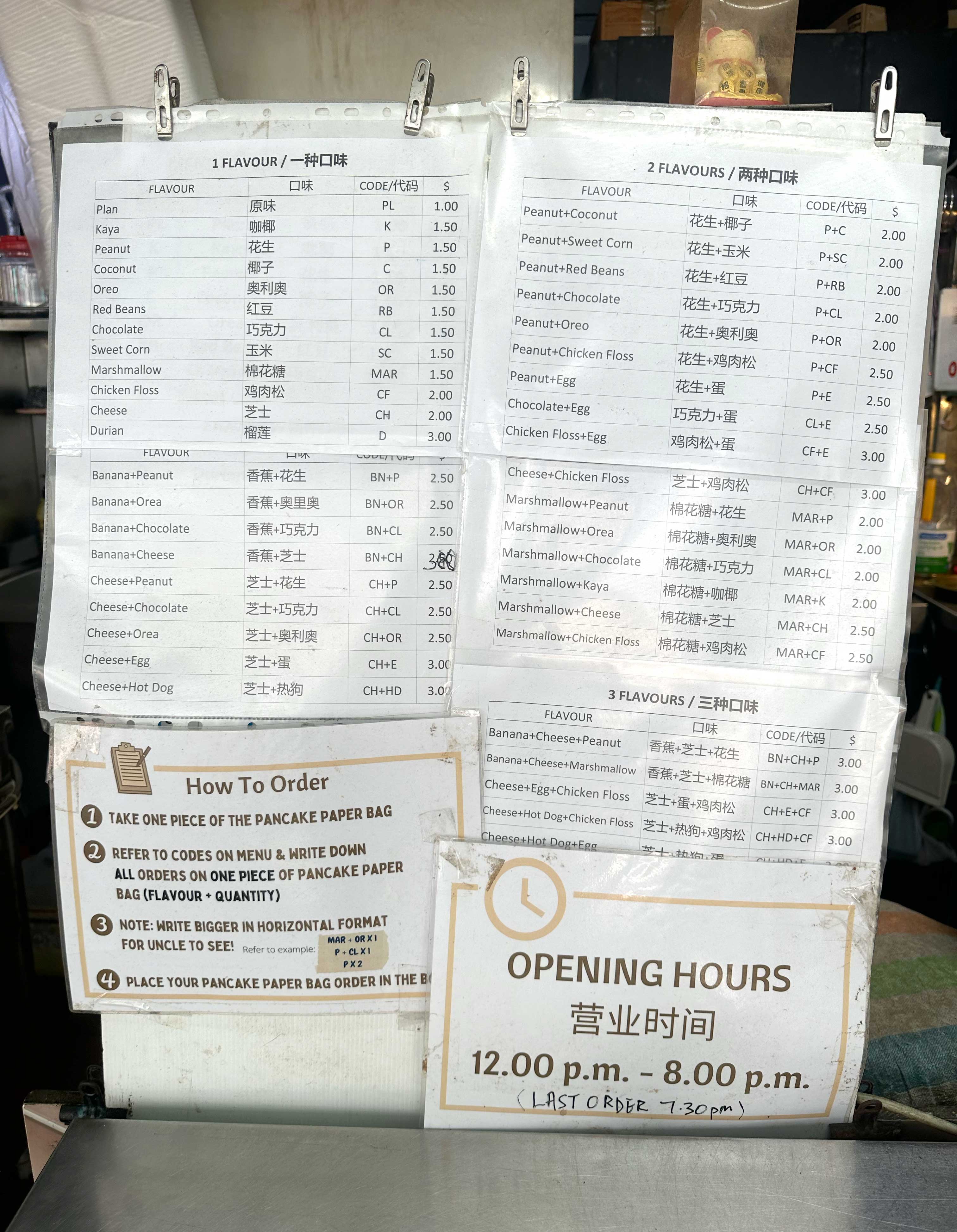 The stall has an interesting ordering system. There’s a sign with instructions: “Refer to codes on the menu and write down your orders on one piece of pancake paper bag (flavour + quantity). Note: Write bigger in horizontal format for uncle to see!”. Do as instructed, then drop your paper into the order box.