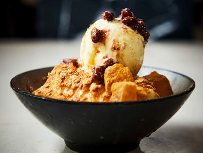 The most traditional-tasting Korean offering, a la patbingsu (shaved ice with sweetened adzuki beans), and it is our favourite. A plain vanilla shaved ice base is topped with red bean and cubes of tender warabimochi (wobbly bracken starch mochi dusted with kinako, or roasted soy bean powder). More of that powder is sprinkled generously over the whole dessert. It’s topped with a scoop of vanilla ice cream. The kinako is toasty, nutty, and we enjoy the delicious roasted flavour it brings to the dessert. The vanilla base is unobtrusive so all the toppings can shine, and the flavours are grown-up, earthy, almost a little savoury, with lots of wonderful chewy textures. A real treat.