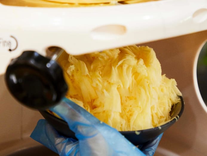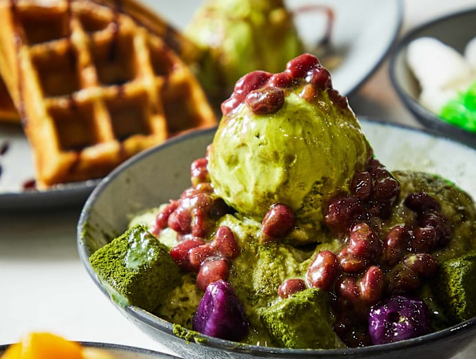 The menu features 10 icy bingsu-inspired treats, ranging from more grown-up and traditional offerings like a matcha, red bean and taro number, to more kid-friendly stuff like Oreos and marshmallows. There’s even a local chendol option. Bingsu is traditionally made with plain, finely-shaved ice, not unlike ice kachang. But here, Pauline uses the same base as Taiwanese shaved ice. A block of slightly sweetened frozen milk infused with flavours like matcha, mango or vanilla, is shaved down with a machine into thick sheets. Pauline then tops it with a variety of add-ons and ice cream. So yeah, this isn’t authentic bingsu, but Pauline says she went with this Taiwanese-style shaved ice because she wanted to offer something a little different than regular bingsu, saying that the flavoured ice offers more variety and makes the desserts more interesting. There’s also buttermilk waffles and ice cream.