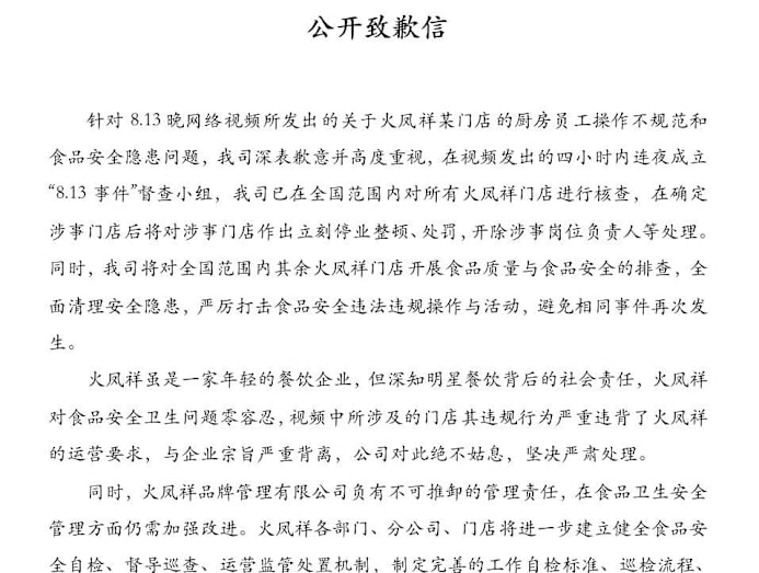 The next day, Zheng Kai issued an apology using the chain's Weibo account to express his “deepest apologies”.