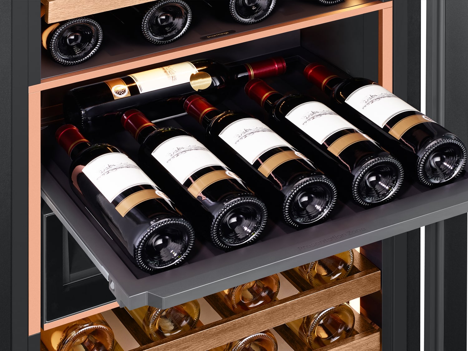 Durable natural oak wood racks are paired with a dedicated presentation zone to allow your most prized bottles to stand out, while a triple-glass door offers protection from the detrimental impact of UV rays on the taste, smell and appearance of wine.