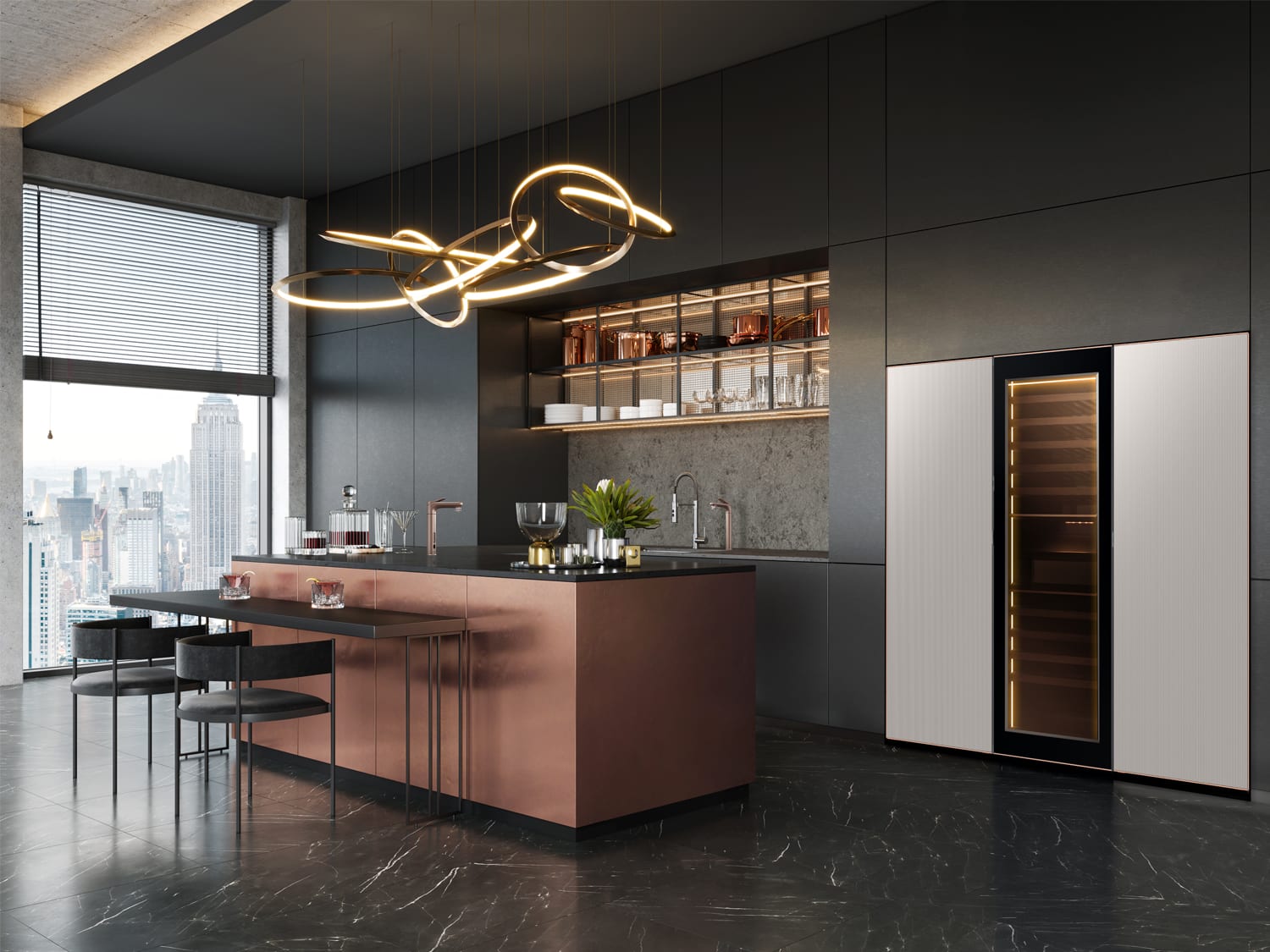 The Bespoke Infinite Line boasts elegant exteriors in a shade aptly named Timeless Greige, which cloaks sleek black metal interiors illuminated by inviting tunnel lighting. The high-gloss metallic finish isn’t just meant to blend with your home’s aesthetic; it’s also made with scratch- and dent-resistant aluminium. Accentuated with distinct copper-edged frames, the fridge and freezer are reminiscent of the avant-garde chillers found in high-end bars and Michelin-decorated restaurants. A hands-free touch sensor lets you open the fridge door with ease.