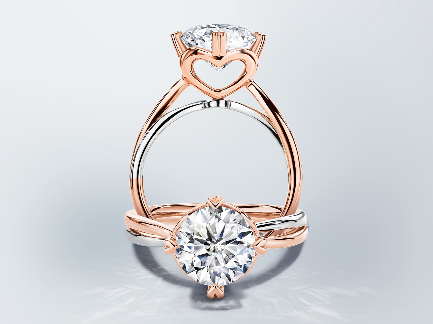 The Love Journey Carita features a stunning solitaire held with signature heart-shaped prongs and a subtle white gold wave on the rose gold band. The Destiny Elise holds the diamond aloft with an infinity symbol setting in rose gold, a subtle nod to the promise of eternal love. The Destiny Esme prefers to showcase the intertwining of two, with dual bands swirling in rose and white gold. For a real show-stopper that dances in the light, the Destiny diamond ring is accentuated with a sprinkling of smaller diamonds on the white gold band.