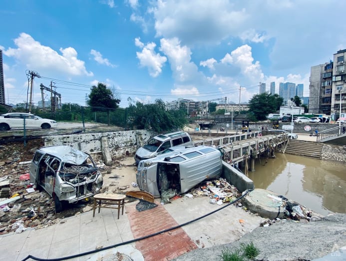 When CNA visited Mr Zhu's home on Jul 24, the water had receded. Everything he owned – household appliances, books, furniture – was soaked and damaged. A brown sludge covered the floor.