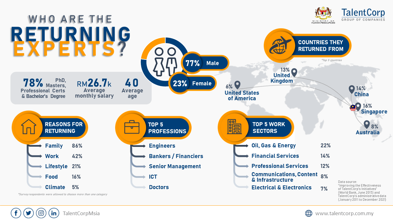 To overcome this, Malaysia’s Ministry of Human Resources set up an agency - Talent Corporation Malaysia (TalentCorp) in the same year. The agency’s aim is to attract and retain the right talent as well as expertise to boost Malaysia’s economy.