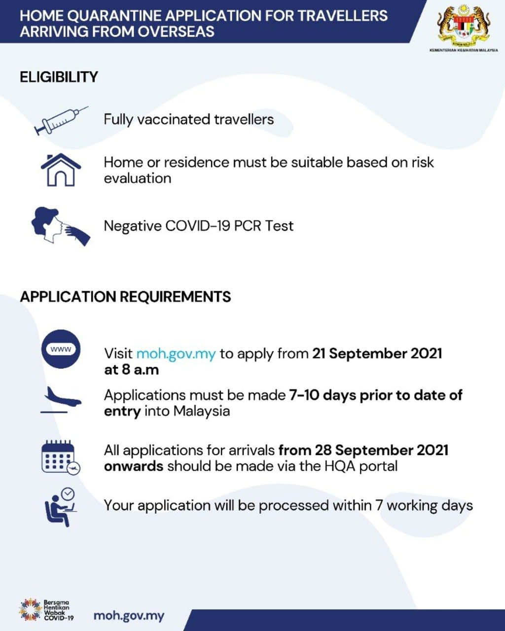 SINGAPORE: Fully vaccinated travellers entering Malaysia will be able to apply for home quarantine from Tuesday (Sep 21) via a new portal on the Ministry of Health's website.