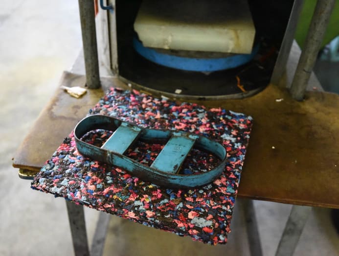 They are cleaned, shredded and mixed with polymer glue, then compressed and moulded into sheets. Afterwards, soles of different sizes are cut out. Whatever remains re-enters the same recycling process to produce other pairs of soles.