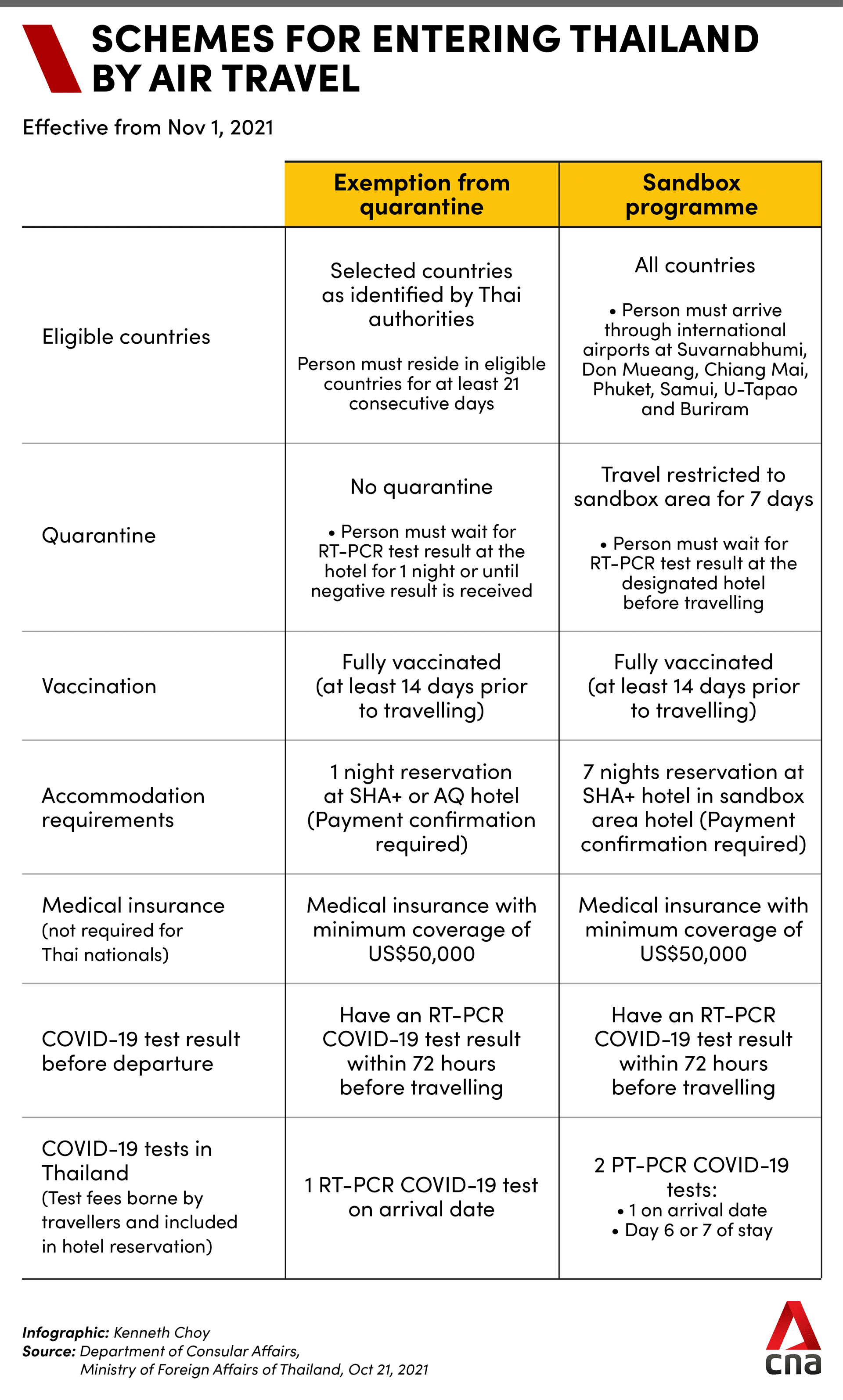 Travellers are also required to present a negative reverse transcription-polymerase chain reaction (RT-PCR) test result issued within 72 hours prior to travel. For non-Thais, medical insurance with a minimum coverage of US$50,000 is compulsory.