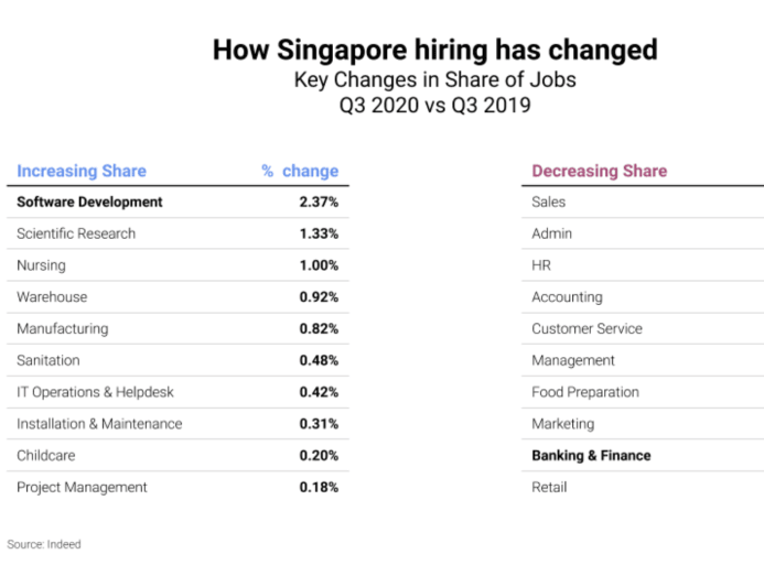 Similarly, Indeed Singapore found that hiring activity of traditional professional services employees - those in sales, administrative, human resource and accounting - fell the most in the third quarter year-on-year, while demand for medical, logistics, scientific and technology roles grew, its Asia-Pacific economist Callam Pickering said.