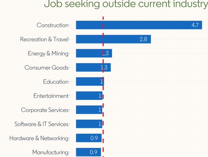 LinkedIn also found that in September, job seekers in industries that were severely impacted by the virus - particularly construction and recreation & travel - were much more likely to apply to jobs outside of their current industry compared to pre-COVID-19 days.